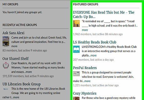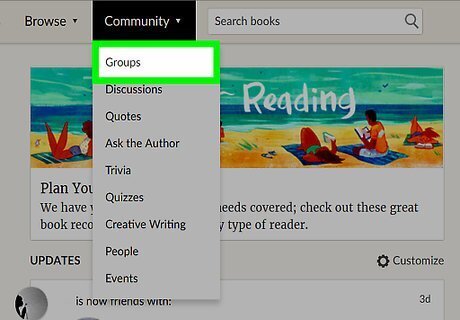 Access the Goodreads Groups feature. Go to Goodreads website and log into your account. Find the little down arrow and click on it by the Community tab on the top notification bar. A drop-down menu should appear. Find "Groups" and click on it.