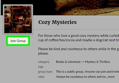 Join a group to access it's discussions. You should join the group with most members, because that usually indicates that the group has a large selection of people who communicate often and may get back to you in a timely manner. Click the Group name from the Goodreads Group page, and click "Join Group" on the group's activity page. If the group is a public group, you should be able to use the group without clicking the Join Group button.