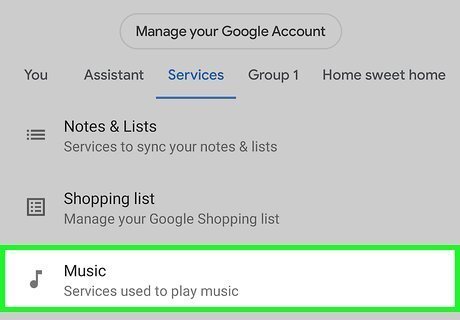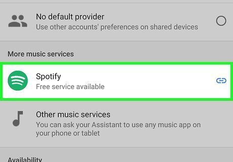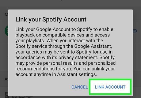 Tap a music streaming service. Many music streaming services work with Google Assistant. These include Spotify, Pandora, YouTube Music, Google Play Music, and Deezer. Tap the service you want to link in the list of available services.