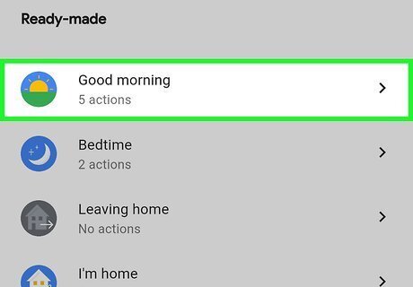 Tap a ready-made routine. The Google Assistant has a number of ready-made routines, such as "Good Morning", "Bedtime", "Leaving Home", "I'm Home", ect. Alternately, you can add a custom routine by tapping the blue icon with a plus (+) sign. The tap Add commands and type the command you want to say to activate the routine. You can add multiple commands for each routine.