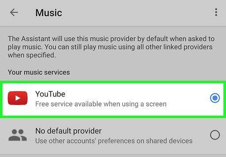 Select a default music streaming service. A list of music streaming services you have linked to your account is listed under "Your music services". Tap the radial button next to the service you want to select as your default service. This is the service Google Assistant will use when you command it to play music.