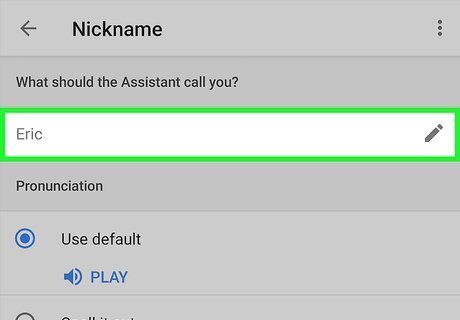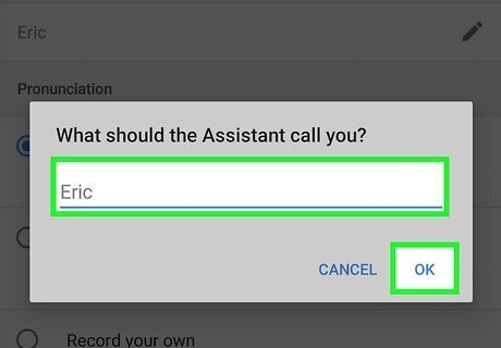 Type your name and tap Ok. This teaches Google Assistant your name Tap Play below "Pronunciation" to hear Google Assistant say your name. If the Google Assistant doesn't say your name right, you can tap Record your own and then tap Record and then say your name to teach Google Assistant how to say your name.