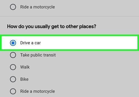 Tap the radial button next your preferred mode of transportation. You can select your preferred mode of transportation for how you get to work as well as other places. Your options are "Drive a car", "Take public transit", "Walk", and "Bike".