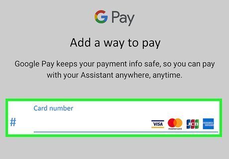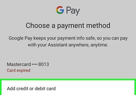 Tap Add credit or debit card. It's at the bottom of the list of credit or debit cards on file. This is where you add credit cards if you plan on doing any online shopping with Google Assistant.