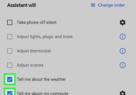 Tap the checkbox Windows Checked next to the actions for the routine. Each routine has multiple actions it can take. Tap the check boxes next to the actions you want Google Assistant to take. To add a custom action to a routine, tap Add action at the bottom of the list. Then type the command for the action you want Google Assistant to take. For example "Play music", or "What's the news". To change the order of the actions, tap Change order at the top of the list of actions. Then tap the icon with two lines to the right of a routine and drag it to change the order the action happens.
