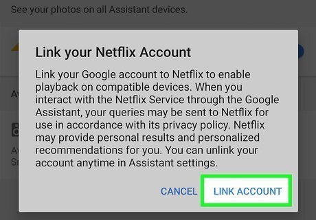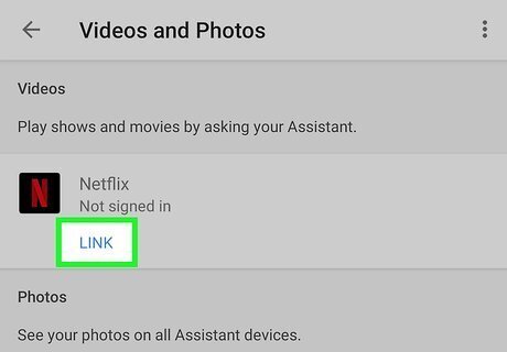 Tap Link below a streaming service. You can link a variety of streaming service with your Google Assistant. These include Netflix, HBO Now, CBS, Starz, and YouTube Kids.