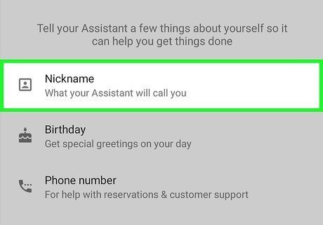Tap Nickname. It's the first option under the "Personal info" tab. This is where you tell the Google Assistant your name.