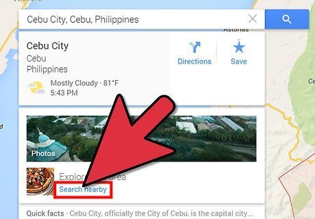 Click on the link labeled "Search nearby" to the left of your current Google Maps session. The "Search Nearby" feature will allow you to search for businesses, organizations, and other places users have registered to Google using Google Places.