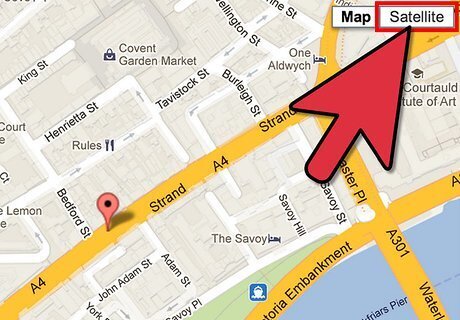 Click on the box labeled "Satellite" in the upper-right corner to see a real image or photo of the home for sale as seen by satellite. Google Maps will then update the map and display the most recent aerial snapshot of the property taken by satellite. Using the satellite view will allow you to see certain physical attributes of homes, properties, and nearby areas. For example, if you are interested in purchasing a home surrounded by trees, the satellite view will often allow you to determine whether or not a home has trees on the property.