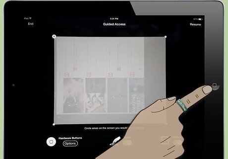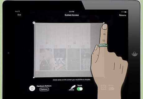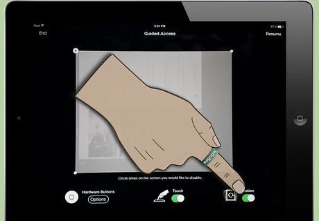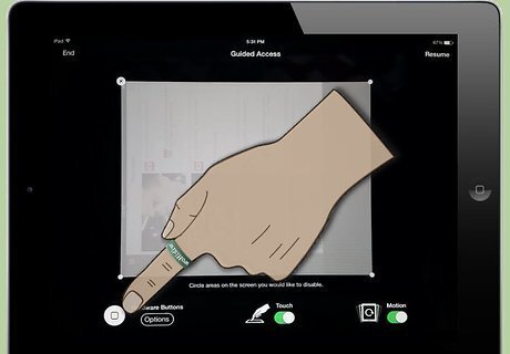 Use your finger to draw around the areas of the screen you want to disable. These "blind spots" will remain the same regardless of what changes on the screen throughout use. You may want to disable areas that show clickable ads, exit buttons, in-app purchases, or other similar "no-go" functions. The boundary you draw doesn't have to be exact. The iPad will turn your boundary into a logical shape for the given area (box, oval, etc.), and even after drawing, you can adjust the edges of the boundary by dragging the corners and sides to cover your desired region.