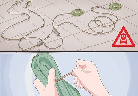 Manage electrical cords. Especially if you plan on using a few strings to decorate, string light cords can quickly get out of hand. Gather together multiple cords together with zip ties and binder clips. Use adhesive wall hooks to collect together and manage wall strung lights. Even gathering together a few separate cord ends can give your light decorations a more tidy appearance. Loose cords can easy become a dangerous tripping hazard. What's more, if you've used wall hangers for your lights, these may do damage to your wall if yanked out suddenly.