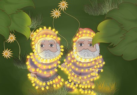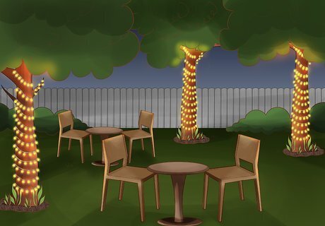 Wrap seasonal items in lights. This technique works great no matter what season it is. Lawn ornaments, like flamingos and garden gnomes, can be bordered or wrapped with string lights to create a mystic garden. Unused wire wreaths can be wound with string lights to make a dazzling display. Get creative with your seasonal decorations. Even decorative jars can be turned into fairy jars. All you need to do is insert some lights. At a family reunion, you might line the underside of tables with lights to give a soft, relaxed, diffused glow to the scene. Try wrapping battery-operated string lights around a wreath. Wrap chairs or trees with string lights in the summer to illuminate your backyard. You can hang outdoor string lights on the deck. If you put them for a short distance of 6 – 10 feet, you can loop the wire string lights themselves. But if you put them for a distance of 10 – 20 feet, support them with gay wires.