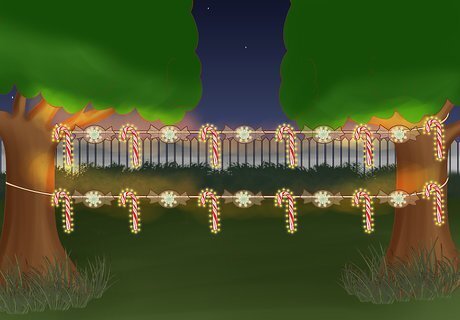 Make giant candy lights. Acquire semi-transparent, shiny wrapping paper or a sturdy, colored cellophane like material. Cover a section of your string of lights with a cylinder of this paper and tie off the ends with twist ties. You may need to bunch up the paper at the middle to give it the appearance of a giant, lit up hard candy wrapper. Avoid using incandescent lights for this idea, as they may generate too much heat and melt the paper or cause it to catch fire.