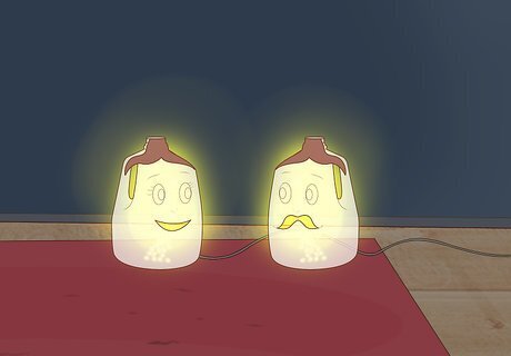 Craft a light buddy from a milk jug. This is a great craft for kids. Take a clean, empty milk jug and use markers to draw a face onto the front of the jug. Feel free to add more features to your light buddy, like string for hair at the top of the jug, buttons for eyes, and so on. Then insert string lights into the jug. Be sure to leave the plug end accessible. Most special features can be added to your light buddy with hot glue or a suitable general purpose glue.