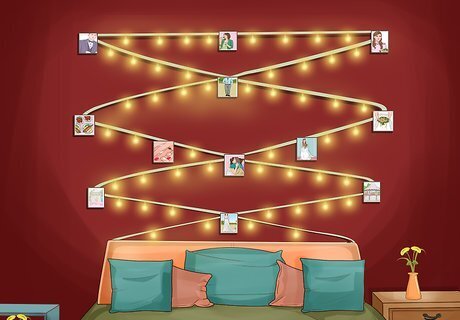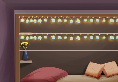 Create a photo display with strung up lights. String up lights between adhesive hooks, nails, or a similar kind of hanger. After the lights are in place, attach photos in between lights with clothespins to make a string light photo display. If you aren't ready to invest in picture frames, this is an inexpensive and charming way of displaying your favorite pictures. Instead of pictures, you can also hang up old postcards for a travel theme.