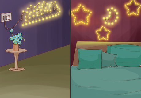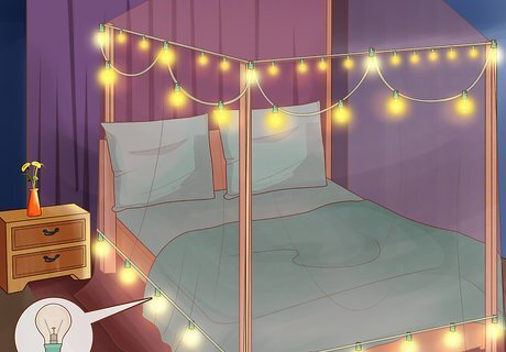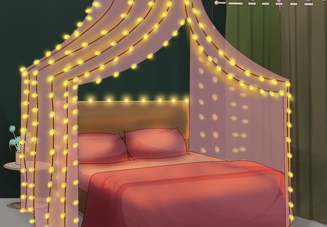 Decorate your bed with lights. If you have a canopy, wrap the canopy frame with lights and allow the ends to trail down into the canopy fabric, or you can wrap the canopy fabric around the lights so that the lights are glowing through the fabric. Even if you don't have a canopy, you can wrap the corner posts of your bed to give cozy, gentle glow to your bedroom. To create a unified color scheme, you may want to match the color of lights that you string up with your comforter, blankets, and so on.