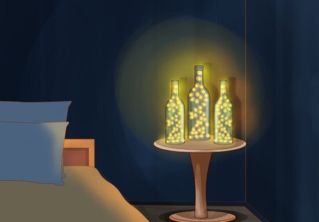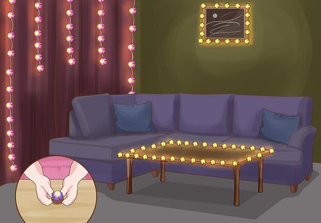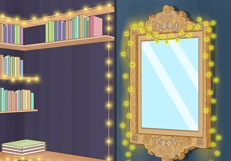 Wrap furniture and items with lights. Everyday household items like mirrors, bookshelves, ornamental baskets, and so on, can be easily dressed up with lights. Simply drape or wrap the lights on the object, or attach the lights in place with things like adhesive hooks, pushpins, and tape. Be careful when using tape to attach your lights to a finished surface, like wood, a painted wall, and so on. Some tapes may damage finished surfaces. You can turn your nightstand into a combination nightstand/nightlight by wrapping lights around it. String lights across a dresser to create mood lighting in your bedroom. Drape lights around the edges of a mirror for a whimsical touch.
