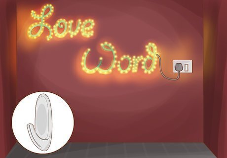 Write out messages with string lights. Lights that are more flexible than your average string lights, like tube lights, are preferred for message writing. More flexible lights will be easier to write messages with. Use pushpins or adhesive hooks to outline your message on a wall. Wind your string lights around these hangers until the lights spell out your message. If you're worried the pushpins might do too much damage to your wall, use a thin piece of board as a mount and use pushpins, nails, or a similar hanger to outline the message. Wind the lights around the hangers, then attach the board to a stud.