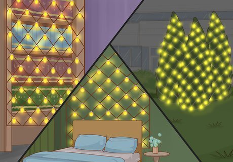 Hang a net of lights in front of displays. Wall decorations, like pictures, curio cabinets, and knickknack shelves are perfect to either have a net of lights in front of or behind. This can give a kind of underwater or otherworldly appearance to your displays. Hang two separate lines of plain string or twine above or behind your display. Pushpins, adhesive hooks, and nails work well for hanging. Run your string lights between the two plain strings, allowing plenty of the string light to hang in a loop below the plain string. Repeat this process for another row of lights. The bottom of your first row and top of your second should be roughly the same height.