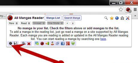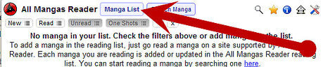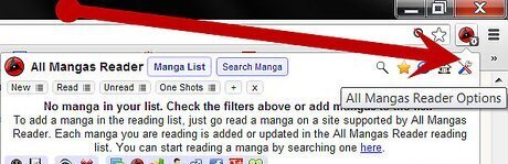 Start adding some manga! This can be done in one of two ways: Click on the "All Mangas Reader" button at the top right of your browser. Click on the "Search Manga" button. Enter a manga name and click on the magnifying glass. Clicking on one manga will result in you being taken to the manga page in question. Once you start reading it, it will automatically be added to your reading list. If you're not sure which sites a particular manga is hosted at, simply click the magnifying glass symbol from the buttons on the top right when you open the extension. Enter the name of a manga, and it will come up with a list of all the supported sites that manga is hosted at. You can click on a manga page listed there and you'll be taken to that site, from where you can start reading immediately. On the search page you can further customize your search to narrow down the results. Under the box where you enter the text to be search is a range of options, allowing you to restrict your search by the language the scan is in and the site at which it is hosted. (i.e. Do you have a particular favourite manga site? Why not try looking for manga from that site?) Simply start reading a manga at any of the supported websites. Anything you read will be added to your reading list.