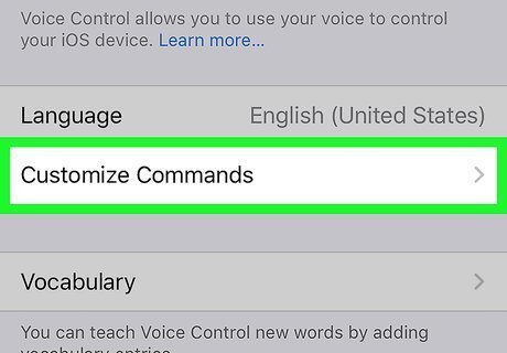 Select an existing command. There are several commands on the "Customize Commands" menu organized into categories. Tap a category to view its associated voice commands, and then tap one of the commands to toggle it on or off. Tapping a command also displays a list of phrases you can use to activate the command. For example, if you tap Text Editing and select Cut that, you'll see a list of phrases like "Cut this" and "Cut selection." Each command offers the option to require confirmation after you say it aloud. To turn this feature on for a command, slide its corresponding switch to the On position.