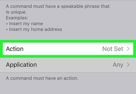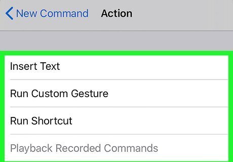 Create an action for your voice command. Here are some examples: Let's say again that you want your email address to appear in the active field when you say "enter my email address." Tap Insert Text in the list of actions, type your email address into the blank, and then tap the back button. If you only want this to occur in one app, tap Application and then choose that app. If you want to create a gesture that taps the screen three times, tap Run Custom Gesture, and then tap the "New Gesture" screen three times. Tap Stop when you're finished, and then tap Save.