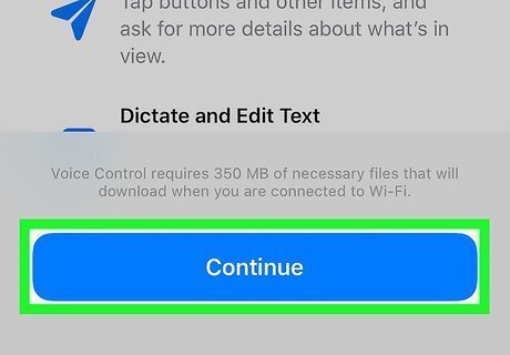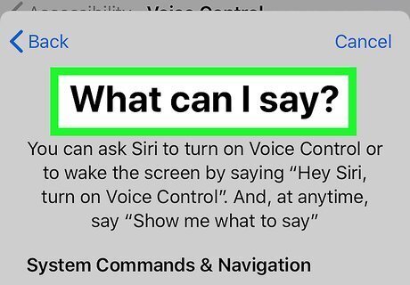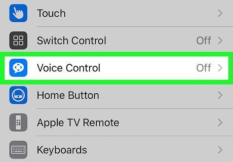 Turn on Voice Control if it isn't on already. You'll know Voice Control is enabled when you see a blue microphone icon at the top-right corner of your screen beside the clock. If you don't see the icon, you can ask Siri to turn it on for you or follow these steps: Open Settings. Tap Accessibility. Tap Voice Control. Slide the "Voice Control" switch to the On (green) position.