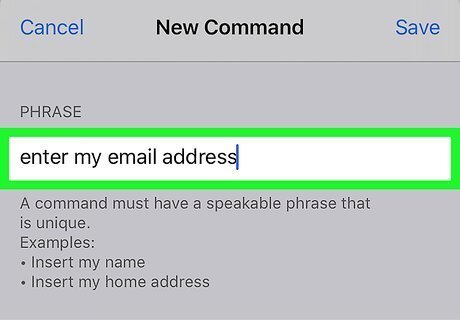 Type the phrase you want to use for this command. For example, if you wanted to make a voice command that types your email address into a blank, type enter my email address.