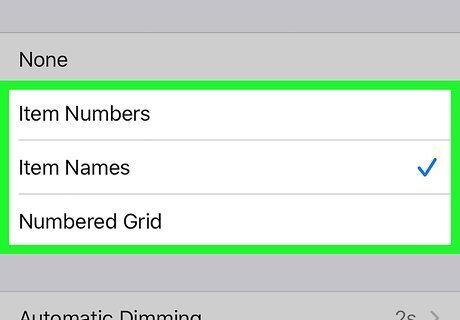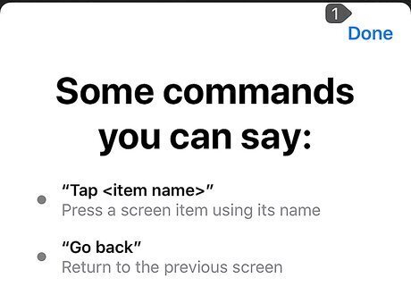 Enable a Voice Command overlay. Though saying "Tap Done'" worked in the previous step, you may run into trouble describing what you want to tap in non-Apple apps. For example, saying "Tap Menu" in Instagram won't open the menu. In this c, case, you'll want to enable an overlay with names or numbers that you can say aloud. To turn on an overlay: Go to Settings > Accessibility > Voice Control. Scroll down and tap Overlay. Select Item Numbers if you want small numbers to appear over icons and tabs. For example, if the number 2 appears on top of the menu icon that you want to tap, you can open it by saying "Tap 2." You could choose Numbered Grid as an alternative if a grid behind the numbers would help you. Select Item Names if you want to speak the names of each icon and tab. For example, if the word "Menu" appears over the menu icon, you could say "Tap Menu." Once the overlay is enabled, names or numbers will appear over each item you can tap. You can then tap the item by saying "Tap 2" (replacing "2" with the overlaid number or name).