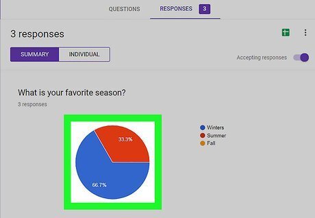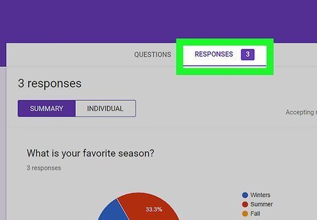Click the RESPONSES tab. You can find this button above your form's title at the top. This will open a summary of all the responses submitted. When you click a form, it opens up to the QUESTIONS tab. You can view your form's questions and response options here.