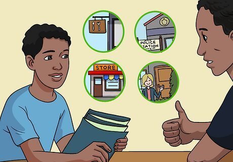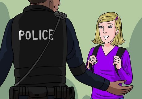 Find a police officer, firefighter or a teacher. If you get lost on the way to school, find a teacher, firefighter or a police officer. Police officers and firefighters have distinctive uniforms. You should be able to recognize a teacher from your school. Make sure you know where the fire and police stations are located on your walk to school, so you can go for help. Ask your parents to give you a cell phone with the police phone number programmed into the phone, so you can call for help if necessary.