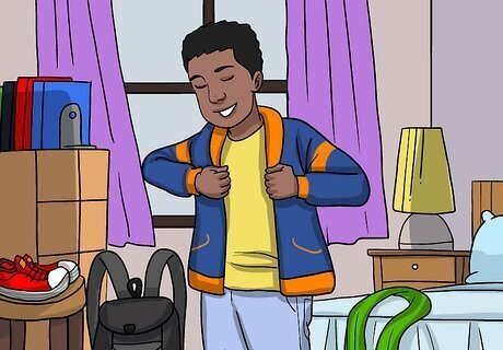 Wear appropriate clothing and shoes. Remember to wear comfortable walking shoes and colored clothing. Colorful clothing will help make you visible to oncoming traffic. In the fall and winter, remember to wear warm clothing. You want to make sure you are warm while walking to school.
