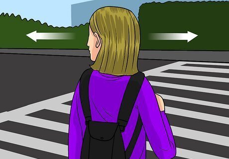 Look both ways to check for oncoming traffic. Before you cross the street, look in both directions to make sure there are no cars coming. Once you have determined that there are no cars coming, you can cross the intersection. If there is a crossing guard, follow their instructions on when to cross the street.