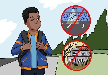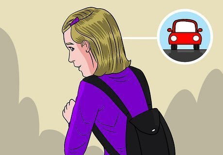 Find a safe route. A safe walking route has sidewalks all the way to the school. The route should also have great visibility at intersections. This means that you can easily see cars coming at the intersection. Your route should also be free of hazards such as major construction projects. Preferably, the route also has crossing guards at important intersections. Choose roads with less traffic and lower speed limits. Crossing guards help you get across the street safely. If there are no sidewalks, you should find roads with large shoulders and walk against oncoming traffic on the shoulder of the road. If your regular route has a construction project, you should find an alternative route.