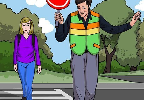 Choose a safe place to cross an intersection. A safe crossing has fewer cars and a clear view of traffic. Ideally, a safe crossing also has a crossing guard. Look to see if there is a crossing guard. If there is a crossing guard, they will tell you when to cross the street.