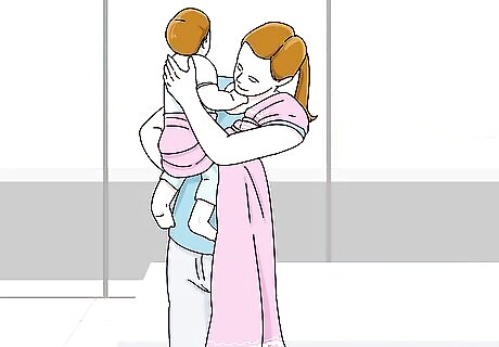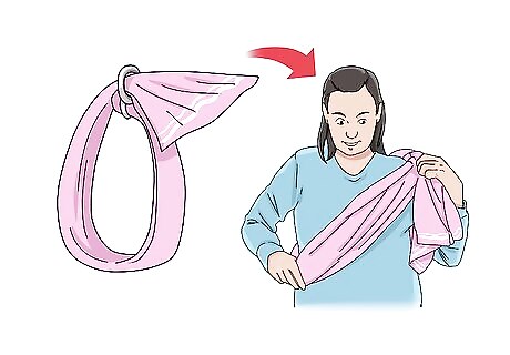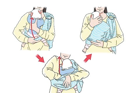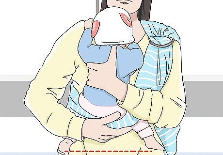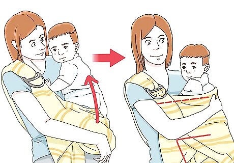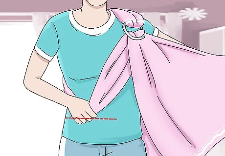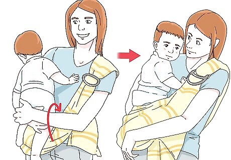 Put the baby into the sling. Begin holding your baby on your hip. The baby should be facing you. Open up the fabric, revealing the pocket that you created when you tied the sling. Then, lower the baby into the pocket.