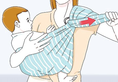 Adjust the sling. Make sure the baby is seated comfortably on your chosen hip. The baby’s knees should be above their bottom in the seated position. Pull on the tail to bring the baby higher. You can pull on the individual rails to make smaller adjustments if necessary. You can nurse in this position by moving to a position where the baby’s mouth is in line with your breast.