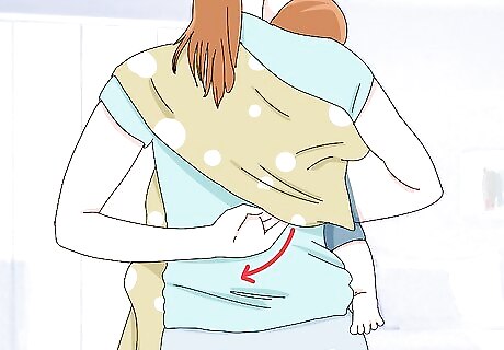 Cover your baby’s back and bottom with fabric. Begin to slide the fabric over your baby. First work the fabric over the baby’s bottom. Then, slide the fabric over your baby’s back. The lower rail of the sling should be extending between each of the baby’s knees. Reach into the sling to pull the bottom panel over the baby’s stomach. You should be supporting the baby’s weight with one hand as you adjust the fabric.