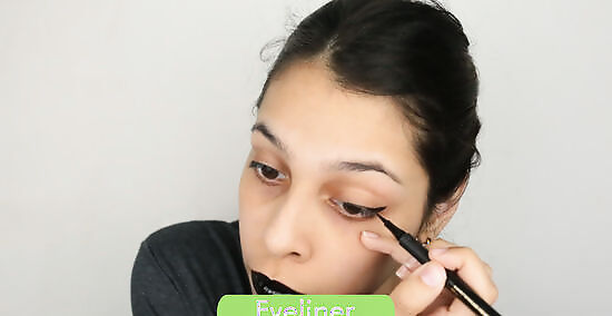 Use black eyeliner to balance your lip. Completely bare eyes might look too naked in contrast to your lips. While you don't want to go overboard with eye makeup, using black liner and mascara adds a nice touch. Try a light cat-eye look, or simply rim your top and bottom lids with a sleep of eyeliner. Use black eyeliner to match your black lipstick. Using a different color could cause your face to look to busy. Avoid piling on the liner or doing a smokey-eye look. This could take your face from looking striking to overly goth.