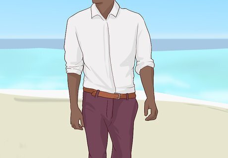Pair with casual fabrics on top. To keep your maroon pants from being too formal, try pairing them with linen, cotton or chambray fabrics on top. These fabrics are lightweight and good for everyday wear, which helps give your outfit a relaxed appearance. A cotton button up is an easy pairing with maroon pants. A chambray work shirt keeps your maroon pants from being too stuffy or serious. Colors such as light pink, navy blue, gold, brown, and cream all look good with maroon pants.