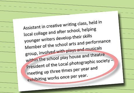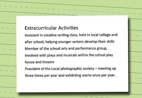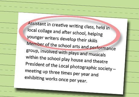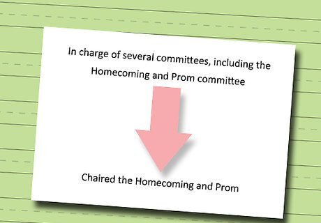Focus on leadership. If you have a lot of extracurricular activities to list, then space on the resume can become an issue. When listing your extracurricular activities, pay special attention to anything that you took a leadership role in. This could be a section leader in the marching band, a team captain, volunteer coordinator, new student orientation, and much more.
