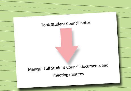 Don’t be modest. While you should never lie, or even embellish, on a resume you should draw attention to your accomplishments. You aren’t trying to get your fellow students admitted, so focus on what you have done. Bad example: “Took Student Council notes.” Good example: “Managed all Student Council documents and meeting minutes.”