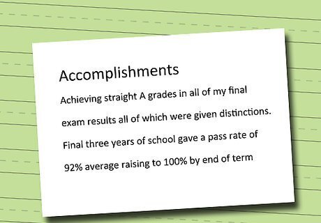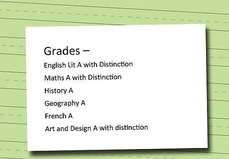 Showcase your grades. If you received good grades in high school, be absolutely sure to draw attention to them. Include a GPA score if over 3.0, and list your class rank or percentile if you have access to it. Good SAT or ACT scores as well as any honors programs should be listed as well. If you have space, you can list some of the AP and college-level course you have taken.