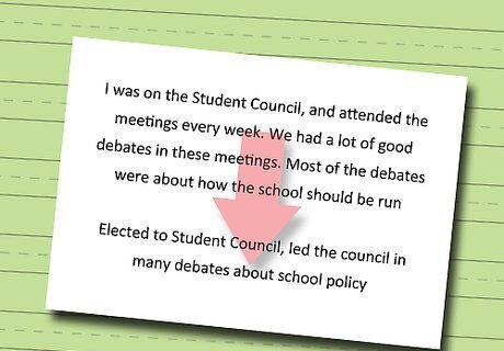 Be concise. When writing about your achievements and activities, avoid going into details about unimportant aspects. Keep your descriptions to-the-point; this will make them more powerful to the reader. Ideally, a resume shouldn’t be more than a page or two long. Any longer and the reader will begin to gloss over the content. Bad example: “I was on the Student Council, and attended the meetings every week. We had a lot of good debates in these meetings. Most of the debates were about how the school should be run.” Good example: “Elected to Student Council, led the council in many debates about school policy.”