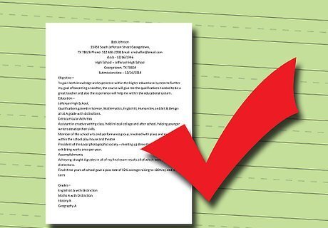 Proofread your resume. Before printing and sending out your resume to colleges with your applications, have your resume proofread by at least two other people. Try to have a guidance counselor take a look at it to see if they have any recommendations. A resume should never be sent out with grammatical errors or misinformation. Computer spell check tools catch many spelling and grammatical errors, but they may not catch instances where you've used the wrong word by accident, or where you've omitted key information.