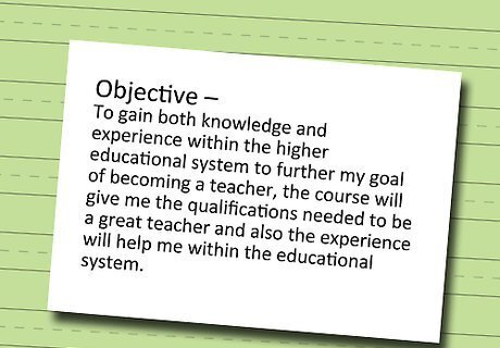 Consider an objective. While not necessary for all resumes, consider writing a short paragraph about what you’d like to achieve out of school. This can be especially useful if you are targeting a specific scholarship, major, or program.