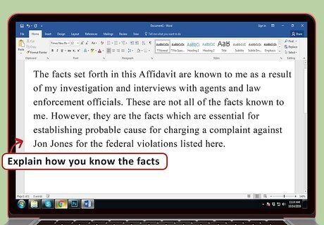 Explain how you know the facts. You should also tell the judge how you know the facts contained in the affidavit. Typically, you know the facts based on your own observation, as well as on what other people have told you. For example, you could write: “The facts set forth in this Affidavit are known to me as a result of my investigation and interviews with agents and law enforcement officials. These are not all of the facts known to me. However, they are the facts which are essential for establishing probable cause for charging a complaint against Jon Jones for the federal violations listed here.”