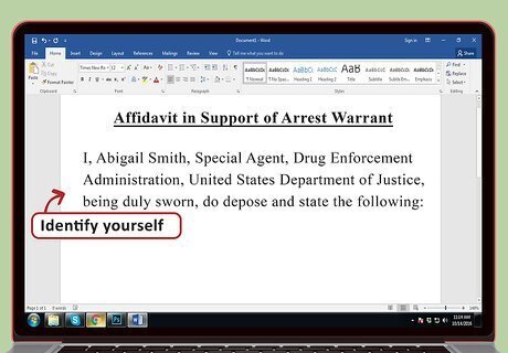 Identify yourself. In the first paragraph, you should state your name and other identifying information, such as your job and department. Also state that you have been duly sworn. Sample language could read: “I, Abigail Smith, Special Agent, Drug Enforcement Administration, United States Department of Justice, being duly sworn, do depose and state the following:”.
