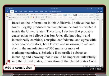Add a conclusion. You need to conclude the drug offense affidavit by explicitly stating that the suspect is breaking the drug laws and that probable cause exists. Your conclusion could read something like this: “Based on the information in this Affidavit, I believe that Jon Jones illegally produced methamphetamine and distributed it inside the United States. Therefore, I declare that probable cause exists to believe that Jon Jones did knowingly and intentionally combine, conspire, confederate, and agree with other co-conspirators, both known and unknown, to aid and abet in the manufacture of 500 grams or more of methamphetamine, a Schedule II controlled substance, intending and knowing that it would be imported unlawfully into the United States, in violation of the United States Code.”