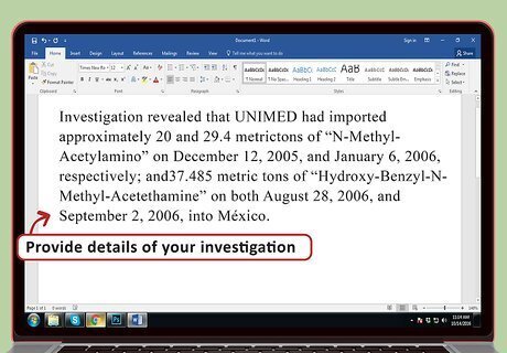 Provide details of your investigation. You also have to give the reason why you think the suspect has committed the drug offense. The amount of detail you provide will depend on the complexity of the drug offense. For example, if the drug offense is fairly simple, you might only want to include what you observed, as well as the dates and times of your observations. You can also rely on credible sources, but you can’t rely solely on gossip or unverified information. By contrast, if you are moving against an international cartel of drug runners, then you might need to provide several pages of detail. You can explain the amount of drugs imported or sold, the dates of the alleged importation, and whether the defendant has faced enforcement activity elsewhere.